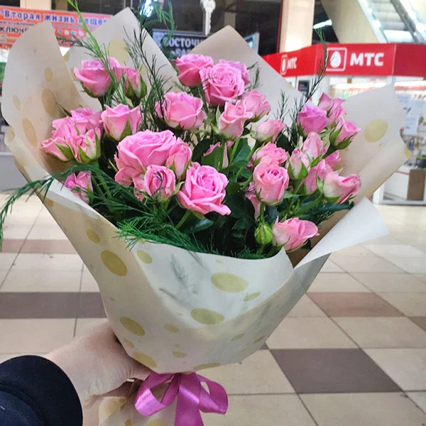 (на фото) роза кустовая розовая - 15 шт, упаковка, лента розовая. Примерный размер: 35Х35 см.